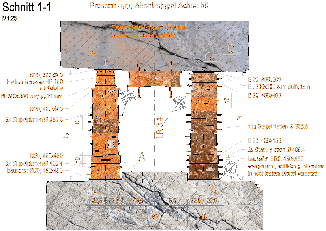 Um den Überbau in die endgültige Lage zu bringen, gab es Absenkprojekte. Historische DWG's zeugen von einst florierenden Traggerüstprojekten - RöRo, Co.Weise, ZRS. Beim Absenken hatte man neben den Widerlagern Betonringe aufgestapelt. Auf diese Betontürme wurde der Überbau abgesetzt, nachdem das Traggerüst abgebaut wurde. Das Absenken des Überbaus in die endgültige Lage wurde durchgeführt, indem die Türme Zentimeter für Zentimeter abgebaut wurden. Ein Turm pro Widerlager hatte eine Hydraulikpresse. Die Betonringe sind mit Stahl ummantelt.