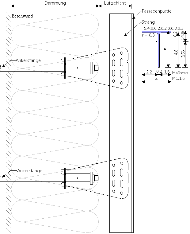 Ein Bauwerk wird mit einer vorgehängten hinterlüfteten Fassade gedämmt. Die Konstruktion muss das Eigengewicht der Fassadenplatten und den Wind tragen. Zum Einsatz kommen in die Wand eingespannte Gewindestangen mit einem Flügelaufsatz. Der Flügelaufsatz reduziert die Biegelänge für das Eigengewicht, indem es Momente an den vertikalen Träger abgibt.